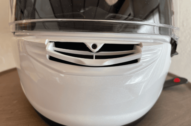 口元のベンチレーションは大型で、走行風を効率的に取り込めるでしょう。開閉もワンタッチでグローブを装着してても楽々。