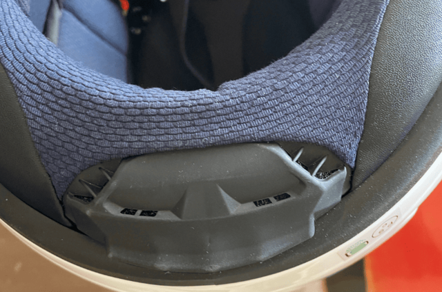 頬周りはややタイトめの設計となっており、顔をしっかりと支えるようなフィット感が特徴的です。強すぎる圧迫感はないものの、スポーツライディングを意識したしっかりめのホールドで、走行中のブレを抑える方向性が感じられます。一方で頭部については圧迫感が少なく、全体的にバランスよくフィットする印象です。